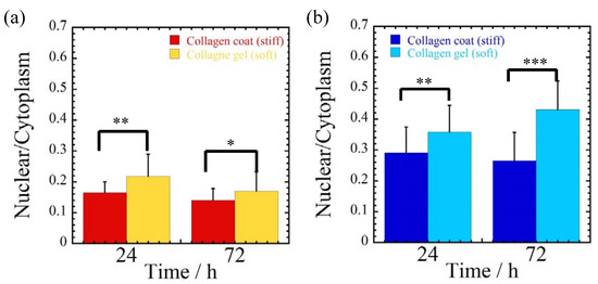 Quantification of cellular spreading parameters of (nuclear/cytoplasm) for (a) MDA-MB-231 and (b) MCF-7 cells cultured on collagen-coated and collagen gel substrates at different time intervals (24 and 72 h). *, ** and *** indicate p <0.05, 0.01 and 0.001, respectively.