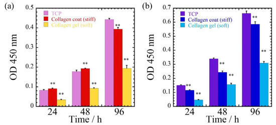 Optical densities (OD) of (a) MDA-MB-231and (b) MCF-7 cells cultured on different substrates (polystyrene tissue culture plates (TCP), collagen-coated, and collagen gel) at different time intervals (24, 48, and 96 h). ** indicates p <0.01 in comparison with TCP at each time.