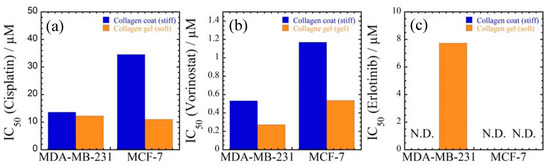 Summary of half maximal inhibitory concentration IC50 of MDA-MB-231 and MCF-7 cells cultured on collagen coated and collagen gel substrates after 72 h of incubation with (a) cisplatin; (b) vorinostat; and (c) elrotinib. N.D.: data are not detected.