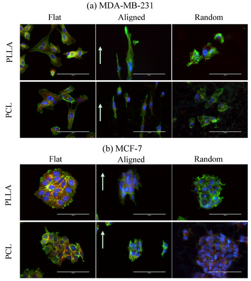For collagen gel and collagen-coated substrates, MDA-MB-231 and MCF-7 cells were seeded at the density of 1.0 × 104 cells/cm2 on 96-well plates and cultured for a period of 24 h and 72 h. On the other hand, both cancer cells were seeded at the density of 1.0 × 104 cells/cm2 on chamber slide and cultured for a period of 24 h, 48 h and 144 h for PLLA and PCL substrates prepared in the Section 2.2.2 and Section 2.2.3 Both cells were seeded on the spin coated flat substrates (designated as F-), random fibers (designated as R-) and aligned fibers (designated as A-) substrates.