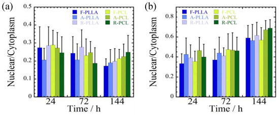 Quantification of cellular spreading parameters of (nuclear/cytoplasm) for (a) MDA-MB-231 and (b) MCF-7 cells cultured on F-, A-, and R-PLLA and/or F-, A-, and R-PCL substrates at different time intervals (24, 72 and 72 h).