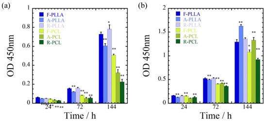 Optical densities of (a) MDA-MB-231and (b) MCF-7 cells cultured on different (F-, A- and R-PLLA, and F-, A- and R-PCL) substrates at different time intervals (12, 24, 72, and 144 h). * and ** indicate p < 0.05 and 0.01, respectively in comparison with F-PLLA substrate at each time.