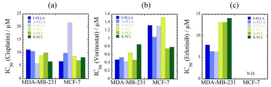 Summary of IC50 of MDA-MB-231 and MCF-7 cells cultured on different (F-, A- and R-PLLA, and F-, A- and R-PCL) substrates treated with (a) cisplatin; (b) vorinostat; and (c) elrotinib.