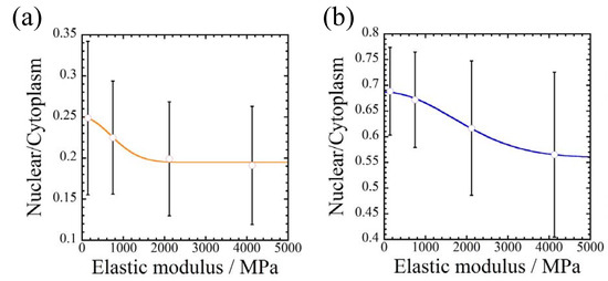 As mentioned above, each of the substrate conditions in this study prompt us to examine the proliferation and drug responsiveness of both breast cancer cells cultured on different substrates with different culture times. To elucidate the effect of substrate stiffness on cell spreading, the spreading parameters (nucleus/cytoplasm area ratio) are plotted as a function of elastic moduli of each fiber substrate (Figure 10). Owing to the difference of the stiffness between PLLA and PCL substrates (15-fold), cellular elongation is caused by the stiffness and surface topographies used to achieve high efficacy in this experiment. These results support the important roles of the substrate stiffness as well as local stiffness of materials obtained from atomic force microscopy (AFM) measurement [33,34,35].