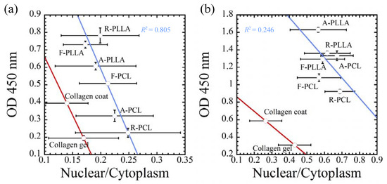Relationship between cellular proliferation and spreading parameters (nucleus/cytoplasm area ratio) for (a) MDA-MB-231 and (b) MCF-7. Optical densities were employed at the time point of 96 h and spreading parameters of (nuclear/cytoplasm) were employed at the time point of 72 h for both cancer cells cultured on collagen-coated and collagen gel substrates. Optical densities and spreading parameters of (nuclear/cytoplasm) were employed at the time point of 144 h for both cancer cells cultured on F-, A-, and R-PLLA and/or F-, A-, and R-PCL substrates.
