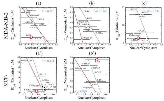 Relationship between IC50 (Figure 4 and Figure 9) of three different anti-cancer drugs (a,a’) cisplatin; (b,b’) vorinostat; and (c,c’) elrotinib and spreading parameters of (nuclear/cytoplasm) at 72 h for (a–c) MDA-MB-231 and (a’,b’) MCF-7cells incubated on different (collagen, PLLA, and PCL) substrates. Red circles indicate the deviation from linear regression.