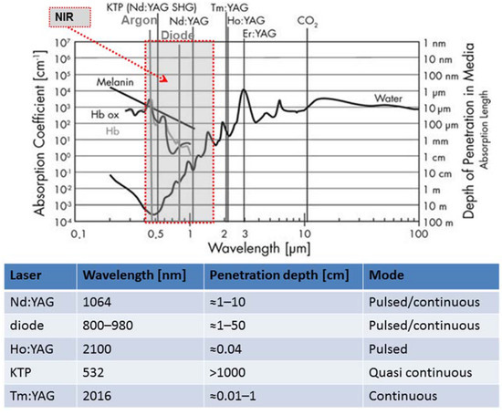 When deep penetration is required, lasers emitting infrared light are employed. Diode lasers, with wavelengths of 800–980 nm and Nd:YAG (neodymium-doped yttrium aluminium garnet; Nd:Y3Al5O12) lasers with a wavelength of 1064 nm have an absorption length of approximately 10 cm, as shown in Figure 2. The KTP:YAG laser (KTP stands for potassium-titanyl-phosphate) emits at 532 nm, and is highly absorbed by hemoglobin but deeply penetrates in water. This difference is pointed in the plot shown in Figure 2. The absorption of light is limited to three important components of biological tissue because the analysis of specific organs will result in difficulties, the data are incomplete, and the experimental data regarding absorption values show high dispersion [7]. Superficial treatments were performed with a CO2 laser (10,600 nm), Thulium (2016 nm), and Ho:YAG (2100 nm) with lower penetration depths (from around 10 μm to almost 1 mm).