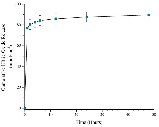 - Coneski, P.N.; Rao, K.S.; Schoenfisch, M.H. Degradable nitric oxide-releasing biomaterials via post-polymerization functionalization of cross-linked polyesters. Biomacromolecules 2010, 11, 3208–3215. [Google Scholar] [CrossRef] [PubMed]