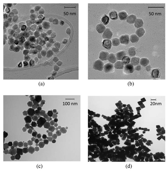 Transmission electron microscopy (TEM) images of the respective magnetic nanoparticles (MNPs) used in this study: (a) 10 and (b) 20 nm diameter spherical Fe/Fe3O4, respectively, (c) 45 nm edge-length and 10 nm height hexagonal Fe3O4, and (d) 20 nm edge-length cubic Fe3O4.