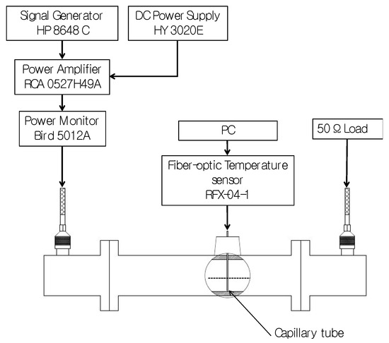 To evaluate microwave heating enhancements afforded by candidate MNPs, a custom electromagnetic testbed was implemented to expose MNPs to microwave radiation in a controlled manner (see Figure 2), similar to the setup described in [26]. MNPs were distributed within a gel phantom, and injected into a glass capillary tube (Internal diameter (I.D.) = 1.33 mm, Kimble 34505-99, Rockwood, TN, USA). A fiber-optic temperature probe (Neoptix RFX-04-1, Quebec, Canada) with sampling rate set to 5 Hz was inserted into the capillary tube and the gel was allowed to set around the probe. The capillary tube was positioned within a WR-340 waveguide, through a hole drilled into the center of the waveguide’s broadside. Two coaxial to waveguide transitions, tuned to ensure a reflection coefficient (S11) ≤ −20 dB in the 2.0–2.6 GHz frequency range, were connected to both ends of the waveguide as shown in Figure 2. Introducing MNP samples within the waveguide yielded minimal changes in the measured reflection and transmission coefficients. MNP samples within the tissue-mimicking gel were exposed to 15 W for 3 min at 2.0 GHz, 2.45 GHz and 2.6 GHz. This power level was selected to constrain peak temperatures within the tissue-mimicking phantom below 70 °C, and thereby limit irreversible changes in the phantom due to microwave heating. To ensure a single-pass exposure of the MNPs to the injected microwave signal, the coaxial to waveguide transition connected to the waveguide output port was connected to a matched load (i.e., 50 Ω). Measured transient temperature profiles were used to calculate the rate of heating during the first 10 s of temperature data immediately after the signal generator was turned off [37].