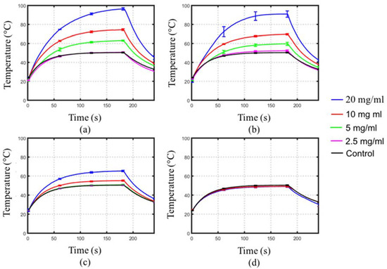 Figure 5 depicts the measured transient temperature profiles during 2.45 GHz microwave radiation of the MNPs mixed within phantoms at different concentrations. Table 1 summarizes the rates of heating for the temperature profiles shown in Figure 5. The heating rates of the phantoms with cubic Fe3O4 MNPs were lower than control phantoms, indicating a decrease in absorption due to the water-based agar being more electromagnetically lossy than the cubic Fe3O4 MNPs. For phantoms with hexagonal MNPs, a statistically significant increased rate of heating compared to control was observed only at a concentration of 20 mg/mL. Phantoms with 10 and 20 nm diameter spherical Fe/Fe3O4 MNPs showed a greater rate of heating compared to control at concentrations of 5, 10 and 20 mg/mL (p < 0.05). Furthermore, larger rates of heating were observed in phantoms with 10 nm diameter spherical Fe/Fe3O4 compared to phantoms with 20 nm diameter MNPs at the same concentration. Overall, higher concentration of MNPs lead to greater heating enhancements.
