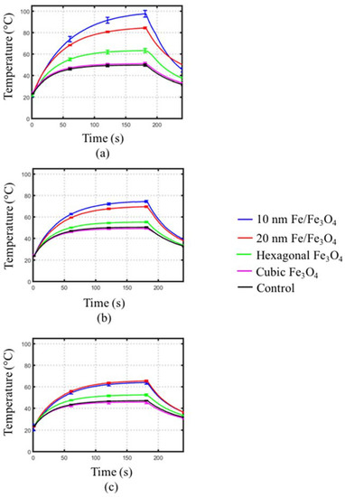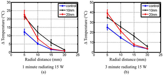 Figure 9 shows the radial temperature profile for control, 10 nm and 20 nm diameter spherical Fe/Fe3O4 phantoms after 1 min and 3 min microwave heating. The phantom with 10 nm diameter spherical Fe/Fe3O4 MNPs yielded a linear decrease with respect to radial distance, while the phantom with 20 nm diameter spherical MNPs and control phantom exhibited a steeper decrease in temperature with respect to radial distance.