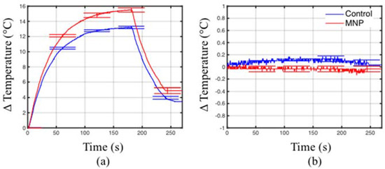Figure 7 shows that no appreciable heating was observed when both control and MNP samples are positioned at locations of the H-field maxima. However, for both samples, heating was observed when positioned at the location of the E-field maxima. This suggests that the dominant mechanism of heating is due to the electric field component.