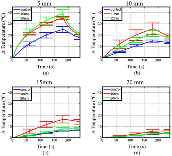 Figure 8 shows the measured temperature rise with fiber-optic probes positioned 5 mm, 10 mm, 15 mm and 20 mm away from a coaxial interstitial dipole antenna powered with 15 W at 2.45 GHz as shown in Figure 4. The tissue-mimicking phantom had a measured dielectric constant, εr, of 48 and conductivity, σ, of 1.5 S/m at 2.45 GHz, comparable to measured values of liver tissue [47]. Table 3 summarizes the maximum temperature at each position shown in Figure 8. At 5 mm from the dipole antenna, samples with both 10 nm and 20 nm diameter spherical Fe/Fe3O4 MNPs showed an increase in the initial heating rate and maximum temperature, but were indistinguishable from each other. However, phantoms with 10 nm diameter spherical Fe/Fe3O4 MNPs yielded a larger maximum temperature and initial heating slope at 10, 15 and 20 mm from the antenna, compared to phantoms with 20 nm diameter spherical MNPs.