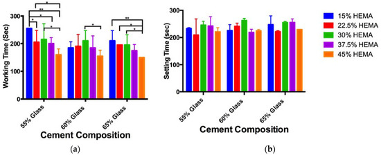 (a)Cement working time, and (b) cement setting time, significant differences are marked with “*” (p < 0.05) or “**” (p < 0.01).
