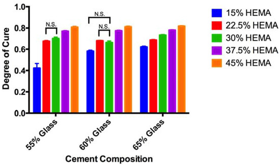 Statistical analysis was performed using Prism 6 (GraphPad Inc., LaJolla, CA, USA) for the two-way analysis of variance (ANOVA) (assessing effect of HEMA and glass content) with a Tukey multiple comparison test, at a significance level of 0.05. Time effects were analyzed using a two way ANOVA, with repeated measures, with a Tukey multiple comparison test. Peak fitting of Fourier transform infrared (FTIR) data was performed using Python (Python Software Foundation, Wilmington, DE, USA).