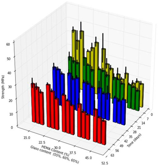 Increasing HEMA content resulted in significant decreases in cement strength at all time points investigated (p < 0.01). Increased glass loading resulted in significant decrease in cement strength at the 60 days time point only (p < 0.01). A significant decrease in cement strength between the 1 and 60 days time points was seen for compositions of group A and B (p < 0.01), while cement compositions of group E increased in strength over 60 days (p < 0.01).