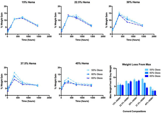 Maximum mass gains ranged from 11.3% (A3, 30 days) to 16.4% (C1, 14 days) of initial dry weight. Glass loading had no effect on the long-term mass gain for compositions of group A, B and C, while glass loading exerted a significant effect for group D and E compositions. HEMA content initially resulted in significant increases in mass gain for all glass loadings; no significant effect was seen at extended time points. While sample mass decreased between 30 and 60 days, it is assumed that hydration increased, and decrease in mass is due to glass filler loss. As such, mass loss between the maximum weight achieved, and the final weight at 60 days was used as a proxy measure of glass degradation. Mass loss from peak weight gain was found to be the greatest in group C.