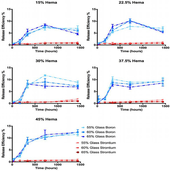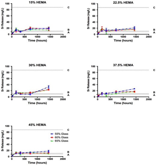 The relative release ratios of B and Sr seen in this study varied greatly from the release profiles reported for the glass (in isolation); the glass filler used is this study has previously been shown to exhibit preferential Sr release over 60 days (release efficiencies of 46% and 19% for Sr and B respectively) [35]. In this investigation, the release efficiency of B increased with increasing HEMA content (Figure 7), indicating that glass network hydrolysis did increase with HEMA content and water sorption, as expected. This trend however did not translate to increased Sr release into the solution. Previous investigation of the glass filler in isolation reported that (i) a single homogeneous glass phase was formed; and (ii) Sr release was governed by the diffusion of water into the glass network [38]. It can thus be assumed that as B release indicates the hydrolysis of the glass network, an equal or greater fraction of Sr must have been lost from the glass filler, despite not being measured in the solution. As B release reached between 8% and 15% of the initial B loading in the cements at the 60 day time point, it can be assumed that strontium release was equal to or greater than 8 to 15%, ten times what was seen in the solution (0.3 to 1.3% of initial Sr loading). As such, it may be reasonably concluded that at a minimum 8 to 15% of the loaded Sr (equivalent to B release levels) was release from the glass filler greatly exceeded all therapeutic thresholds, exceeding 100 mg/L after 14 days.