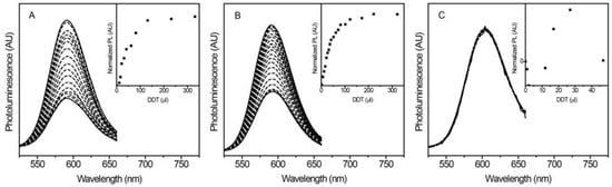 Figure 3. PL spectra of Mn2+:ZnSe/ZnS@SiO2 NPs with medium ZnS shells encapsulated in silica suspended in phosphate-buffered saline (PBS) with successive addition of 1 mM (A) dithiothreitol (DTT), (B) L-cysteine (CYS), and (C) N-acetylcysteine (NAC). Insets: corresponding plots of normalized PL (PL change) with increasing thiol.