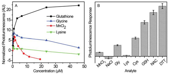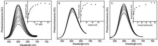 Optical sensors are available for detection of many analytes, and the high functionality of thiols within cells creates an immediate demand for the development of suitable probes for their continuous detection [17,18,19,20]. The literature describes multiple detection methods for thiols and thiol-containing peptides, but most of the available probes are based on organic dyes, which are prone to photobleaching, produce broad photoluminescence (PL) spectra, and are reliant on cellular extracts [21,22]. Atypical cellular thiol levels can lead to heart disease, cancer, stroke, and many neurological disorders [23,24,25,26,27,28,29]. One of the most abundant cellular thiols is the cysteine-containing tripeptide glutathione (GSH). GSH is a vital antioxidant for detoxification of reactive oxygen species, and patients with dementia often have low concentrations of GSH within the brain [22,26]. Intracellular GSH concentrations range from 1 to 15 mM, with poorly established concentrations across cellular compartments [30,31]. The development of probes that are resistant to photobleaching and provide real-time monitoring of thiols is of practical importance.