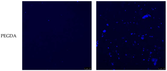A confocal microscopy image from the top to the bottom surface of PEGDA and PEGDA-PCL scaffold with and without cells after 14 days of cell culture. The blue dots represent cells embedded in PEGDA and PEGDA-PCL scaffolds with DAPI (4’,6-diamidino-2-phenylindole) stained nucleus. The length of the scale bar in each image is 100 microns.