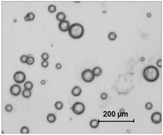 Microcapsules (MCS) were prepared using an in-situ polymerization of formaldehyde via the urea method, as described previously [28]. First, DHEPT was added to the TEGDMA monomer at 1 wt %. A mixture of 50 mL of distilled water and 13 mL of a 2.5% aqueous solution of EMA copolymer was prepared in a 250 mL-Erlenmeyer flask. The flask was suspended in a water bath on a hot plate. Second, the shell-forming material urea (1.25 g), ammonium chloride (0.125 g), and resorcinol (0.125 g) were added into the solution under 300 rpm agitation by a magnetic stir bar (Ø = 7.8 mm, length = 50 mm, Fisher Scientific). Resorcinol was added in the reaction of shell formation to enhance the rigidity of the shell [30]. The pH was adjusted to 3.5 by the drop-wise addition of 1 M NaOH. Then, the agitation rate was increased to 400 rpm, and 30 mL of the TEGDMA-DHEPT liquid was added into the flask [31]. After 10 min of agitation, a stabilized emulsion of fine TEGDMA-DHEPT droplets were formed. Then, 3.15 g of a 37% aqueous solution of formaldehyde was added. The stirring was continued with heating to 55 °C for 4 h [28]. In this process, ammonium chloride catalyzed the reaction of urea with formaldehyde to form PUF at the oil–water interface to develop the shell [29]. The resulting microcapsules were rinsed with water and acetone, vacuum filtered, and air dried for 24 h. The microcapsules’ structure was confirmed by optical microscope 4× (TE2000-S, Nikon, Japan) and SEM (Quanta 200, FEI, Hillsboro, OR, USA), as shown in Figure 1.