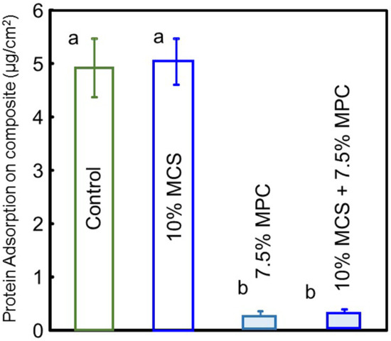 Protein adsorption onto composite surfaces. The composite with 7.5% 2-methacryloyloxyethyl phosphorylcholine (MPC) had the lowest amount of protein adsorption, which was approximately 1/16 those of the composite control and the composite with 10% microcapsules (MCS) (p < 0.05). Different letters indicate values that are significantly different from each other (p < 0.05).