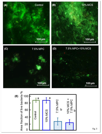 Figure 3 shows the early bacterial attachment onto composite surfaces by representative live/dead staining images after 4 h of the inoculum. Live bacteria were stained green, and dead bacteria were stained red. The composite discs had primarily live bacteria, with few dead bacteria. Both the control composite and the composite with 10% MCS but without MPC had noticeably more bacteria coverage than the composites containing MPC. The quantification of the area fraction of the composite surface covered by live bacteria is plotted in Figure 3E, and corroborates with the outcome found in the qualitative evaluation of images where composites with 7.5% MPC had great bacterial adhesion reduction.