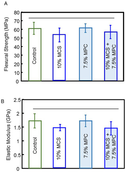 The flexural strength and elastic modulus of composites with combined and isolated tested components were evaluated after one day of water storage, and are plotted in Figure 4 (mean ± SD; n = 6). The flexural strength and elastic modulus of a composite containing 10% microcapsules and 7.5% MPC were not significantly different from controls (p > 0.5).