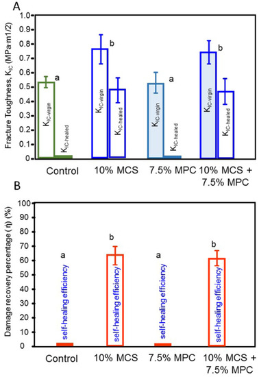 Fracture toughness and self-healing of a composite containing microcapsules and MPC. (A) Initial and post-healing fracture toughness (KIC), and (B) the damage recovery for KIC according to the formulation designed for each tested composite. In each plot, values with dissimilar letters are significantly different from each other (p < 0.05).