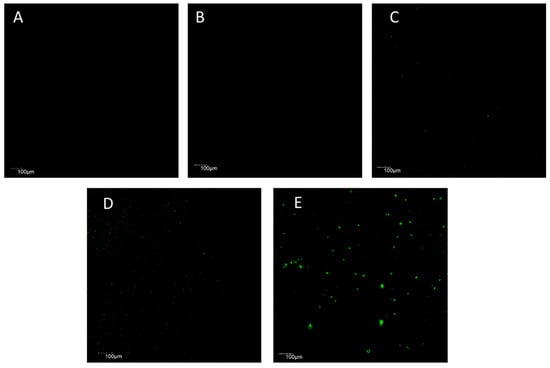 Figure 2. Fluorescence images of substrates before and after modifying with E2. The images of the substrates (A) Ti; (B) Ti-pDOP; (C) Ti-pDOP-E2-0.1 µg; (D) Ti-pDOP-E2-1 µg and (E) Ti-pDOP-E2-10 µg were obtained by confocal laser scanning microscope (CLSM) after staining for the immobilized estradiol with anti-rabbit IgG–FITC. Green fluorescence was observed on (C) Ti-pDOP-E2-0.1 µg; (D) Ti-pDOP-E2-1 µg and (E) Ti-pDOP-E2-10 µg as compared to controls (A) Ti; (B) Ti-pDOP. The fluorescence intensity increased with increasing concentrations of immobilized estradiol.