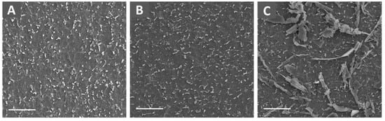 Figure 3. SEM images of substrates before and after the modification with E2. (A) Ti; (B) Ti-pDOP, (C) Ti-pDOP-E2-10 µg (Scale bar = 20 µm). Large crystals of estradiol were observed on (C) Ti-pDOP-E2-10 µg.