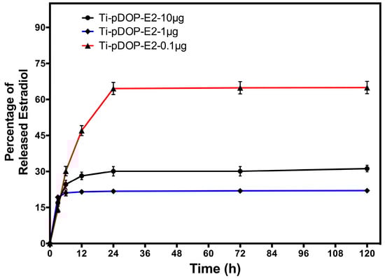 The respective release of E2 from Ti-pDOP-E2-10 µg, Ti-pDOP-E2-1 µg, and Ti-pDOP-E2-0.1 µg were measured at various time points (3, 6, 12, 24, 72, and 120 h). The substrates were immersed in PBS at 37 °C and the released E2 was assayed using E2 ELISA kit as described above.