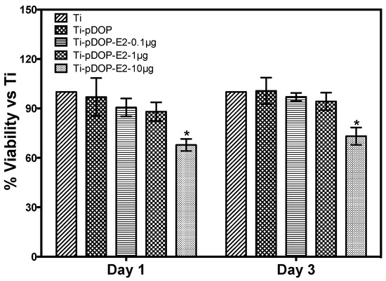 The cytotoxic effects of different substrates on MC3T3-E1 preosteoblast cells were investigated by MTT assay after day 1 and day 3 of culture (Figure 5). Cell proliferation on Ti-pDOP-E2-0.1 µg and Ti-pDOP-E2-1 µg were similar to Ti and Ti-pDOP (Figure 5) on both days. However, the cell metabolism was significantly reduced for Ti-pDOP-E2-10 µg (Figure 5) as compared to that of pristine Ti.