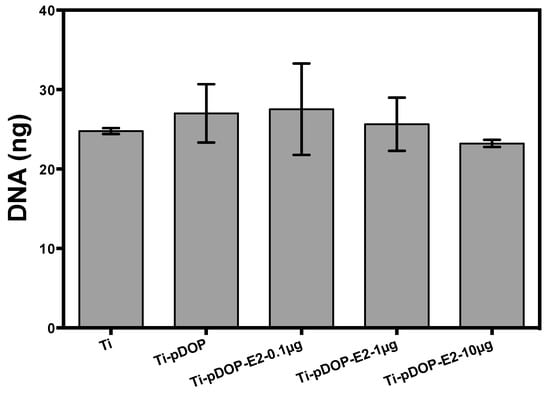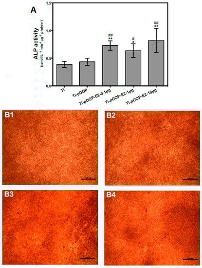 Various concentrations of E2 loading solutions (10 μg/50 μL, 1 μg/50 μL, 0.1 μg/50 μL in absolute ethanol) were prepared and 50 µL of each concentration was carefully transferred onto the surface of Ti-pDOP substrates. They were then gently rinsed three times with water to wash away unbound E2 after 24 h. The prepared substrates were denoted as Ti-pDOP-E2-10 µg, Ti-pDOP-E2-1 µg, and Ti-pDOP-E2-0.1 µg, respectively.