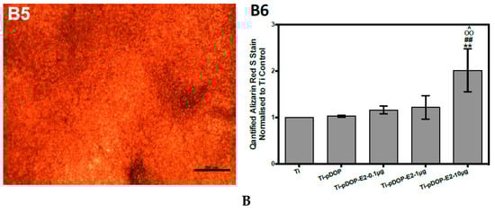 MC3T3-E1 preosteoblasts were seeded on the different substrates and maintained for 1 week. As shown in Figure 6A, cells cultured on E2 immobilized substrates Ti-pDOP-E2-0.1 µg, Ti-pDOP-E2-1 µg and Ti-pDOP-E2-10 µg showed higher alkaline phosphatase (ALP) activity than that of the pristine Ti and Ti-pDOP (p < 0.05). Calcium deposition was studied at the end of 4 weeks via alizarin red S staining (Figure 6(B1–B6)). Calcium deposition in Ti-pDOP-E2-10 µg (Figure 6(B5)) was slightly higher as compared to that of the pristine titanium and Ti-pDOP (Figure 6(B1,B2)). However, substrates with lower E2 densities (Ti-pDOP-E2-0.1 µg and Ti-pDOP-E2-1 µg, Figure 6(B3,B4) had similar calcium deposition pattern to that of pristine Ti and Ti-pDOP (Figure 6(B1,B2)). The irregular staining patterns on the substrates is because of the different thickness of deposited calcium. To verify the results alizarin stain were quantified (Figure 6(B6)). Alizarin red S stain on Ti-pDOP-E2-10 µg were significantly higher than Ti, Ti-pDOP, Ti-pDOP-E2-0.1 and Ti-pDOP-E2-1 µg.