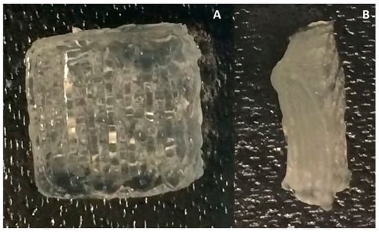 Three-dimensional-printed alginate scaffold of 14 layers (2.24 mm in height): (A) Top view and (B) side view.