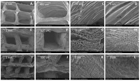 SEM images for surface analysis of the treated scaffolds: (A–D) non-treated scaffolds scale bars: (A) 1 mm; (B) 400 μm; (C) 10 μm and (D) 5 μm. (E–H) shows two days of PBS treatment at 37 °C, 5% CO2, with scales of: (E) 1 mm, (F) 500 μm and (G,H) 5 μm. (I–L) shows seven days PBS treated scaffolds, with scales bar of: (I) 1 mm; (J) 500 μm; (K) 5 μm and (L) 3 μm.
