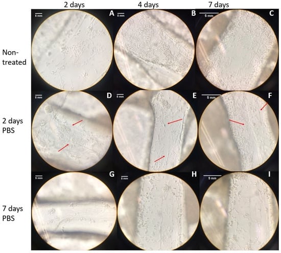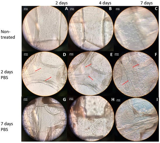 Cell morphology and attachment in scaffolds for untreated (A–C), two days PBS treatment (D–F) and seven days PBS treatment (G–I). All images are observed at 40× magnification. Red arrows indicate the cells, in place with a fibrous structure (scale bars = 5 mm).