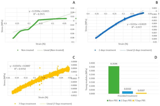 Young’s modulus of the 2% alginate scaffolds, crosslinked in 50 mM CaCl2. (A) Non-treated scaffold modulus is 0.3594 MPa (green); (B) Two-day treated scaffold modulus is 0.0310 MPa (blue); (C) Seven-day treated scaffold modulus has a value of 0.0107 MPa (yellow); (D) Comparison of the Young’s modulus of the experiments. The number of samples is the same as the ones used in the mechanical analysis.