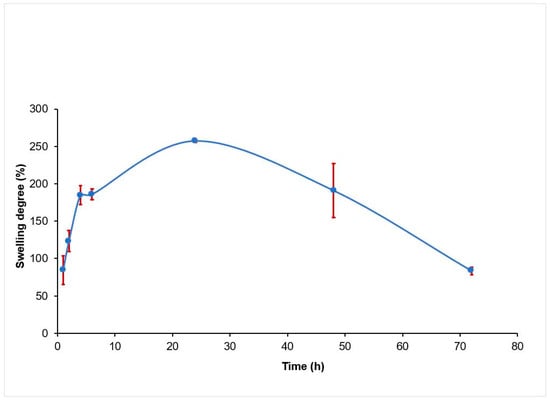 The swelling degree for the 2% alginate scaffolds was examined over 72 h, and shown in Figure 7, with an average of three samples. It is seen that the swelling degree increases, up to 257.16% at the first 24 h, and then decreases, down to 83% at end of 72 h.