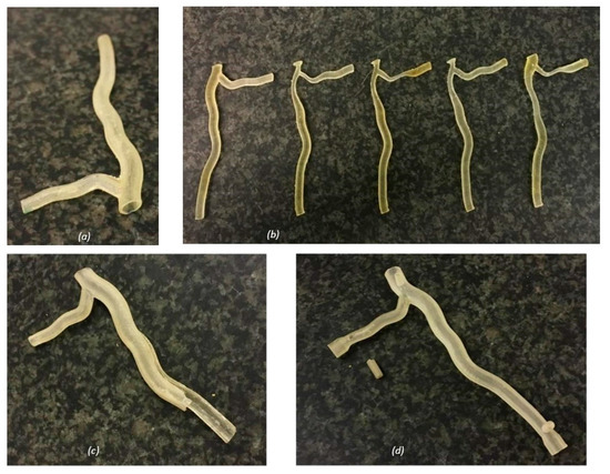 Printed resin models: (a) hollow healthy bifurcation; (b) anatomical solid models of the healthy and stenosed cases; (c) hollow artery model damage, with cracking along the length of the artery; and (d) hollow artery model with a connection via a small port (damaged during testing). Full design rationale and dimensions used to design the models are included in detail in Section 4.1.