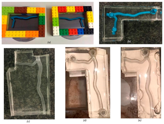 Wax printed PolyDiMethylSiloxan (PDMS) models: (a) half cross-section model set in PDMS using a Lego mold; (b) full cross-section model before wax was removed using acetone; (c) completed half cross-section model; (d) completed full cross-section model; and (e) defects seen in PDMS model of stenosis case one. Full design rationale and dimensions used to design the models are included in detail in Section 4.1.