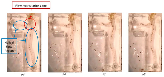 Sequential images taken from the flow visualization test of the healthy artery bifurcation taken at (a) 0.25 s; (b) 0.5 s; (c) 0.75 s; and (d) 1 s.