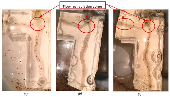 Static images taken from recordings of flow visualization tests: (a) healthy artery bifurcation (b) stenosis case one; and (c) stenosis case two.