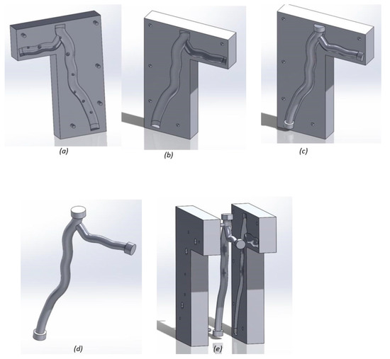 Mold design for future research:(a) mold top with pouring holes and air outlets printed using the resin printer; (b) mold base printed using the resin printer (c) inside mold inserted into the cavity in the mold base; (d) inside mold printed using the wax printer; and (e) three mold components demonstrating a potential fit.