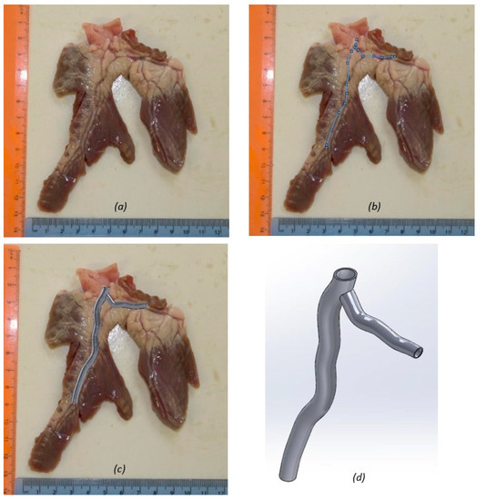 The initial Computer Aided Engineering (CAE) Model was developed from the coronary artery of a healthy porcine heart, acquired from a supplier (Fresh Tissue Supplies, Horsham, UK). The coronary artery from the porcine heart was dissected and provided a scaled image of the first bifurcation (Figure 6). The image was then used to create a geometrically accurate spline shape from which to build the artery model (Figure 6). Whilst the model uses a subject specific shape, the lumen dimensions reflect an average human coronary artery bifurcation taken from clinical literature [8,78]. The CAD platform used was SolidWorks (Solidworks 64, Dassault Systémes, Vélizy-Villacoublay, France). The initial model was developed as a thin walled hollow tube (Figure 6), using the loft function to specify the inner lumen dimensions at points along the artery.