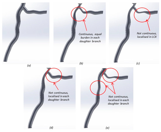To model disease cases, each stenosed artery was divided into planes located at the bending point of the spline (Figure 8). On each of these planes, the diameter of the artery was input, enabling the length of the stenosed section to be controlled for each case (Figure 8). Stenosis is not always evenly displaced around the inner lumen wall of the artery, and can be categorized as a lateral, myocardium, or pericardium site plaque burden [80]. Where plaque is not diffuse (i.e., circumferentially located), as in cases two and four, lateral site burden was chosen, as this occurs most frequently [80]. Lateral site burden was governed using blocks in SolidWorks, which were scaled in each instance (Figure 8). Table 2 shows the differences in plaque location for each stenosis case.