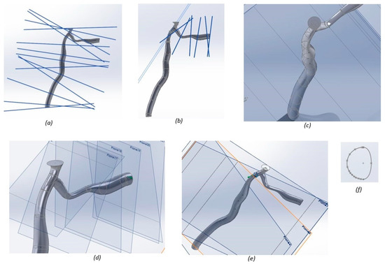 Model set-up for stenosis case 2: (a) planes used to govern the geometry for the left anterior descending (LAD); (b) planes used to govern the geometry for the left circumflex (LCX) artery; (c) geometric constraints for the LAD artery; (d) geometric constraints for the LCX artery; and (e) constraint to the lateral site plaque; (f) cross section of the artery.